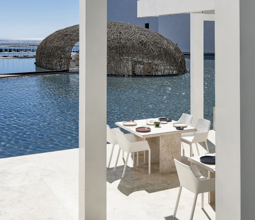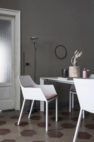 Кресло Mem от Кристофа Пилле, изготовленное из литого полипропилена, армированного стекловолокном, с едва подчеркнутыми углами и изгибами сочетает в себе прочность и элегантность. Два отверстия в сиденье являются эстетичной, но в то же время функциональной деталью, поскольку позволяют штабелировать кресла, несмотря на их объемную форму. Кресло Mem также доступно со съемной мягкой полиуретановой подушкой, которая сочетается по цвету с сиденьем или контрастирует с ним, или с поясничной подушкой, обитой различными тканями, что делает сиденье еще более удобным.