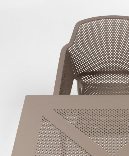 Net – это моноблочная модель из стеклопластика с перфорированным рисунком, который равномерно распределен по трехмерной поверхности сиденья. Материалы не подвержены воздействию УФ-излучения, благодаря этому кресло долго сохраняет свой первоначальный вид и не выцветает на солнце. Кресло оснащено нескользящими накладками на ножках, поэтому его можно разместить возле бассейна, а также оно может штабелироваться, что облегчает его хранение.