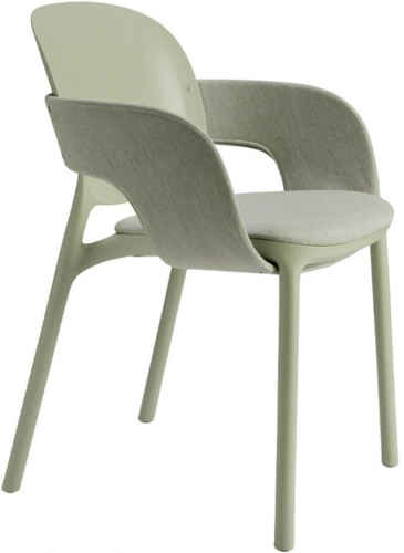 Hug технически представляет собой монокок из технополимера, но на самом деле это гибкая система, в которой компоненты объединяются для создания различных конфигураций стула и кресла. Предназначенный для использования на открытом воздухе, он также хорошо вписывается во внутренние помещения благодаря возможности покрытия некоторых его частей тканью. Внимание к декоративному аспекту, не в ущерб функциональности, подтверждается предложением вариантов текстиля: выбор мягких оттенков, от нейтральных до светло-голубых и бисквитных, сделанный интересным благодаря эффекту меланжа и видимым нитям утка, которые можно выбрать среди различных предложений в каталоге.