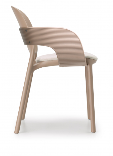 Hug технически представляет собой монокок из технополимера, но на самом деле это гибкая система, в которой компоненты объединяются для создания различных конфигураций стула и кресла. Предназначенный для использования на открытом воздухе, он также хорошо вписывается во внутренние помещения благодаря возможности покрытия некоторых его частей тканью. Внимание к декоративному аспекту, не в ущерб функциональности, подтверждается предложением вариантов текстиля: выбор мягких оттенков, от нейтральных до светло-голубых и бисквитных, сделанный интересным благодаря эффекту меланжа и видимым нитям утка, которые можно выбрать среди различных предложений в каталоге.
