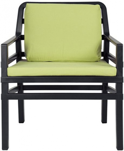 Кресло Aria из стеклопластика решетчатой структурой и матовым покрытием, похожим на лакированное дерево. Доступен ряд цветовых комбинаций каркаса и подушки.