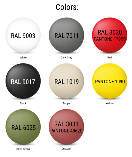 Основные варианты цвета указаны в палитре на сайте. Дополнительные варианты цвета: оранжевый RAL2008, тропический зеленый RAL6018, серебристый серый RAL7040, светло-голубой RAL5012, опалово-зеленый PANTONE 2246, темно-синий RAL5005.