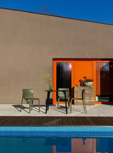 После стула Air, первого сиденья, в котором используется технология воздушного формования, стул First снова открывает новые горизонты в этой технологии (отсюда и его название). Пустая рама используется не только для объемов с небольшим трубчатым сечением, но и для более широких и сложных объемов всего сиденья и спинки. Это позволяет создать более органичную трехмерную форму без видимых трубчатых структур, которые можно увидеть на других стульях. Изящный и нежный дизайн стула First делает его подходящим и для использования на открытом воздухе.