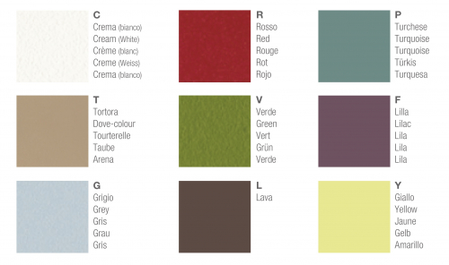 Варианты отделки: кремовый (С), тортора (T), серый (G), красный (R), зеленый (V), лава (L), бирюзовый (P), лиловый (F), желтый (Y).