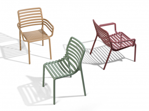Свежая, легкая и эргономичная, Doga - это новая очаровательная коллекция уличной мебели: Кресла с подлокотниками и без них, кресло для отдыха и моноблочный журнальный столик из стеклопластика (полипропилен и стекловолокно). Вся коллекция была вдохновлена решетчатым дизайном, но Рафаэлло Галиотто, ее дизайнер, придал ей современный оттенок. Плавные линии спинки и сиденья стульев характеризуются игрой заполнений и пустот, отмеченных последовательностью горизонтальных планок.