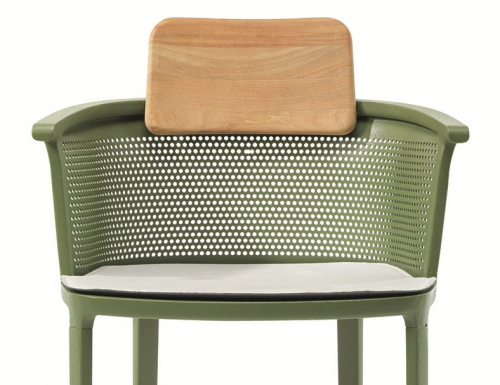 Кресло Nicolette с узнаваемой охватывающей формой отличается интересным сочеатнием материалов и цветов: каркас из литого алюминия с шестью различными вариантами отделки (Warmwhite, Olive Green, Coffee, Warmgrey, Sepia Black, Warmred), задняя часть с необычным микроперфорированным рисунком,и спинкой из натурального тика, также для заказа доступна мягкая вставка со специальной плиссированной структурой