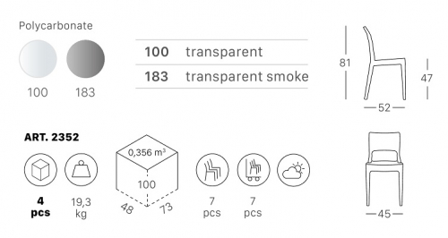Информация по уходу: прозрачные стулья можно протирать тряпкой из микрофибры, допускается применение нейтрального мыльного раствора. Запрещается использовать спиртосодержащие или ацетоносодержащие (а также им подобные) средства.