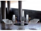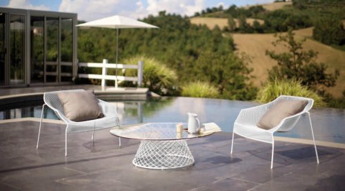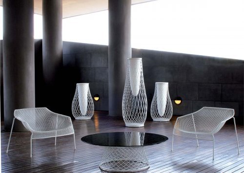 Тонкий плетеный стальной каркас является отличительной чертой коллекции, отмеченной стройными линиями и общей гармонией. Стальные стулья в паре с прозрачными стеклянными столешницами "освещают" поверхность стола, придавая им непостижимое качество.