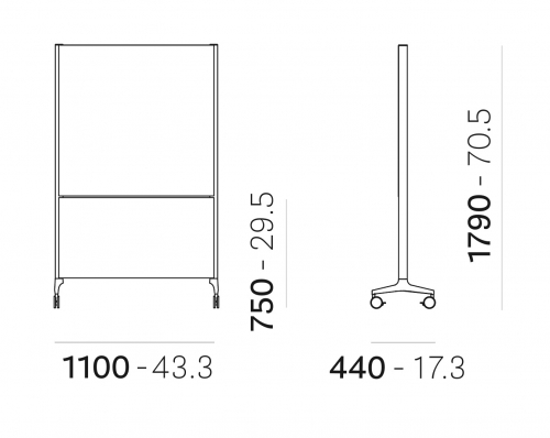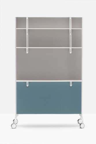 Модель представлена с каркасом из двух литых алюминиевых оснований и двух опор из экструдированного алюминия, покрытых с обеих сторон звукопоглощающими панелями. Имеется возможность дополнить изделие аксессуарами на любую из его сторон, такими как полки или крючки для одежды. Перегородка также может быть использована в качестве держателя для телевизора. Выпускается как с колесиками, так и без них. Возможно исполнение перегородки с магнитной доской.