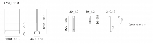 Модель представлена с каркасом из двух литых алюминиевых оснований и двух опор из экструдированного алюминия, покрытых с обеих сторон звукопоглощающими панелями. Имеется возможность дополнить изделие аксессуарами на любую из его сторон, такими как полки или крючки для одежды. Перегородка также может быть использована в качестве держателя для телевизора. Выпускается как с колесиками, так и без них. Возможно исполнение перегородки с магнитной доской.