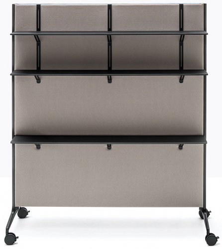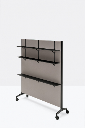 Модель представлена с каркасом из двух литых алюминиевых оснований и двух опор из экструдированного алюминия, покрытых с обеих сторон звукопоглощающими панелями. Имеется возможность дополнить изделие аксессуарами на любую из его сторон, такими как полки или крючки для одежды. Перегородка также может быть использована в качестве держателя для телевизора. Выпускается как с колесиками, так и без них. Возможно исполнение перегородки с магнитной доской.