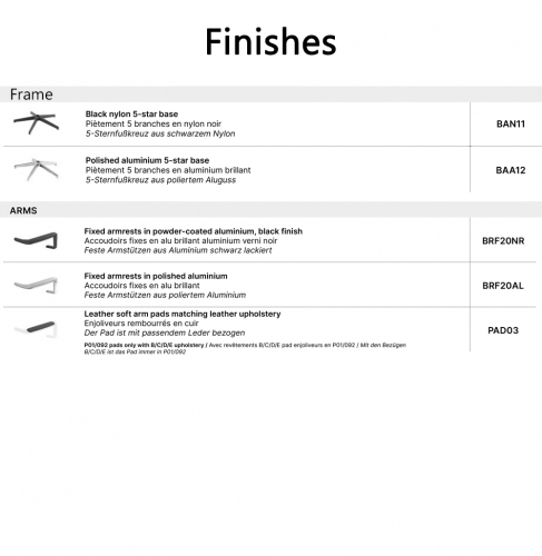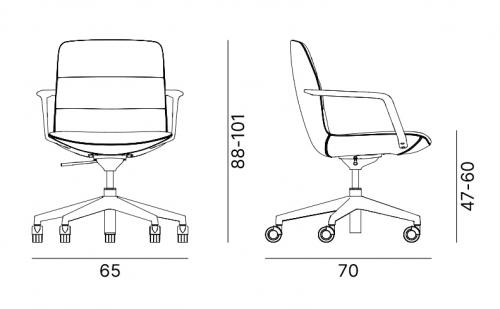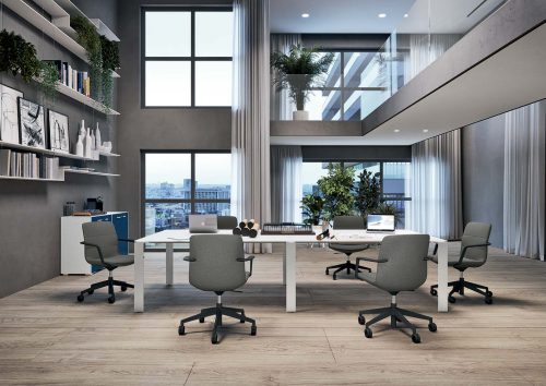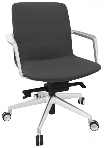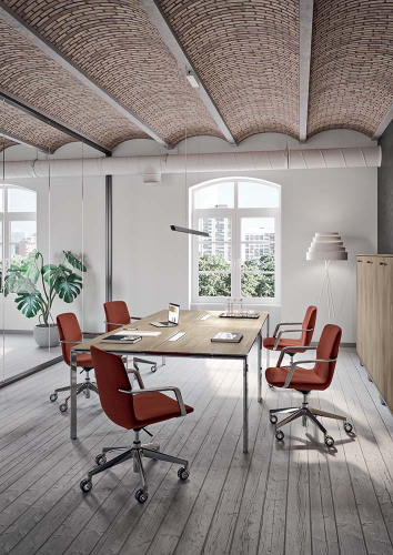 Diesis выпускается в трех вариантах: с высокой спинкой и встроенным подголовником, с низкой спинкой с низкой спинкой и основанием на колесах и модель для посетителей. Версия с низкой спинкой идеально сочетается с рабочим столом персонала и столами для совещаний: эргономичная и мягкая спинка с пдоголовником и алюминиевые подлокотники, которые могут быть обтянуты кожей, органично вписываются в конструкцию.