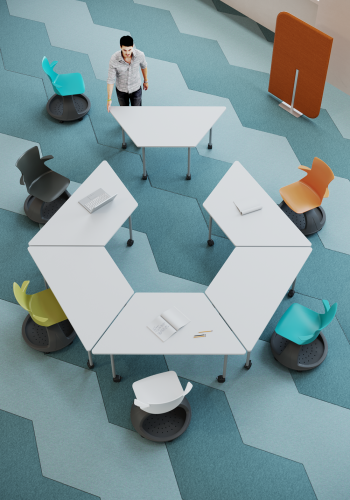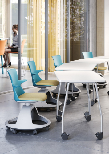 С коллекцией стульев Tema организация учебного пространства становится простой и быстрой. Переход от традиционных уроков в очной форме к групповым или командным занятиям происходит за несколько минут, а Ваши собственные инструменты (портфели, устройства и т. д.) всегда с вами.