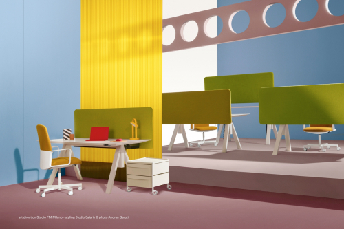 Adj Desk с практичной и регулируемой по высоте столешницей — это стол для организации комфортного, динамичного офисного пространства. Модель со стальными ножками, образующими в проекции треугольник, и столешницей с опорной рамой из экструдированного алюминия. Два электрических привода, подключенные к блоку питания, управляются с помощью регулировочного переключателя, расположенного под столешницей. Приводы перемещаются синхронно и позволяют выбирать удобную высоту столешницы: от 740 до 1140 мм. Кабельный канал, встроенный между столешницей и панелью, позволяет закрепить звукопоглощающую панель с тканевым покрытием для разделения пространства между двумя письменным столами.