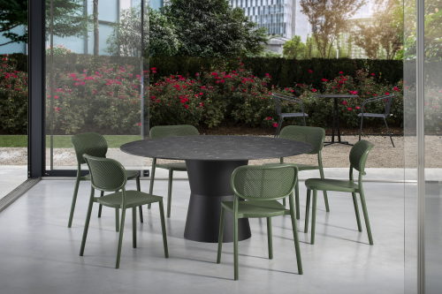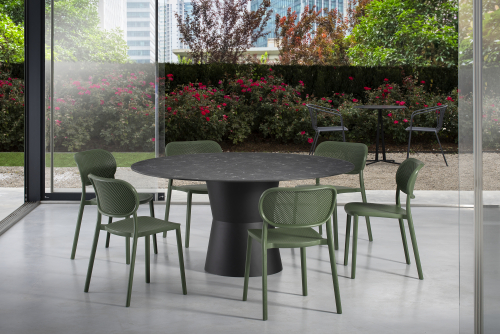 Универсальная коллекция Nidaba имеет геометричный и минималистичный характер и представляет собой столы с основанием из 100% перерабатываемого технополимера, которое дополнено круглыми и овальными столешницами из ламината (ЛДСП) или компакт-ламината (HPL).