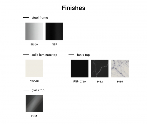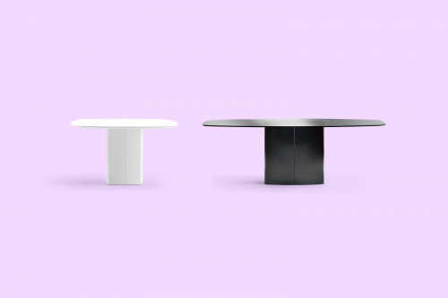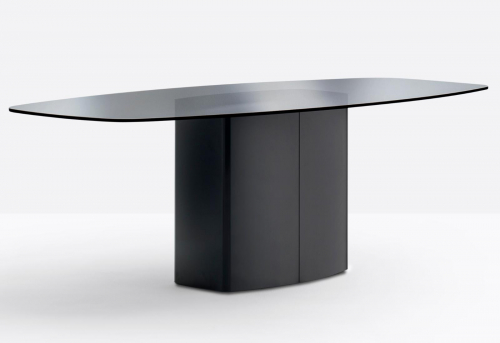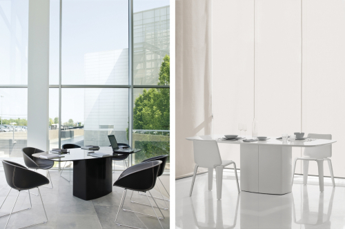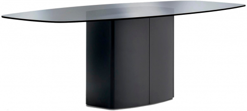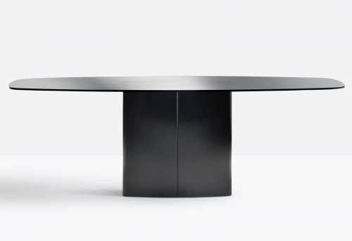 Aero – это стол больших размеров, простой на вид, но с сильным характером. Стальная оболочка, разделенная на две части, скрывает центральное квадратное основание со скругленными углами в сочетании с изысканной столешницей из стекла или твердого ламината.