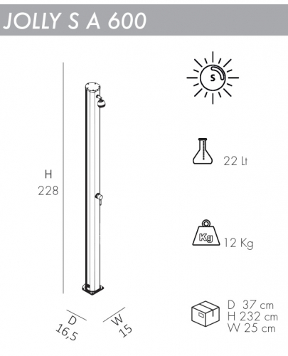 Летний душ Jolly S A600 с прямой колонной сочетает в себе простоту и функциональность. Солнечный душ Jolly S A600 подходит для установки на открытом воздухе в гостиницах, кемпингах, туристических или пляжных курортах, или для частного использования.
