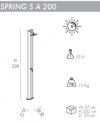 Вдохновленный дизайном коллекции Dada S, но в уменьшенной версии, солнечный душ Spring S A200 сочетает в себе элегантность и минималистичность формы и является отличным решением для гостиниц, кемпингов, туристических или пляжных курортов, или для частного использования.