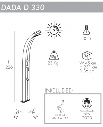 Благодаря современному дизайну серия летних душей Dada является жемчужиной компании Arkema. Душ Dada D330, имеющий кнопку-таймер, разработан специально для общественных мест, где необходимо сократить расход водных ресурсов. В нижней части корпуса душа находится дополнительный кран, который удобно использовать для мытья ног. Такой солнечный душ отлично подходит для установки на открытом воздухе в гостиницах, спа-салонах, фитнес-центрах, кемпингах, а также туристических или пляжных курортах. Гармония и элегантность его формы делают его подходящим для любой обстановки.