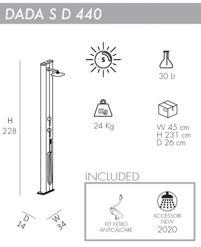 Благодаря своему простому и минималистичному современному дизайну уличный душ Dada S является жемчужиной в продукции компании Arkema. Солнечный душ Dada S D440 подходит для установки на открытом воздухе в гостиницах, кемпингах, туристических или пляжных курортах, или для частного использования. Гармония и элегантность его формы делают его подходящим для любой обстановки. Душ оснащен гибким шлангом, благодаря которому удобство в использовании возрастает в несколько раз.