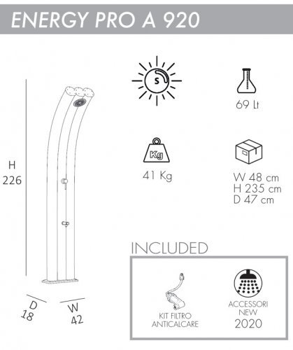 Energy Pro вершиной дизайна уличных душей. Он идеально подходит для сада, бассейна, пляжного домика или пристани для яхт. Душ оснащен баком для воды на 69 л и способен обеспечивать бесконечное теплое водоснабжение. В нижней части корпуса душа находится дополнительный кран, который удобно использовать для мытья ног. Таким образом, душ пригоден для использования в общественных местах: гостиницы, спа-салоны, фитнес-центры, кемпинги, туристические или пляжные курорты, или для частного использования.