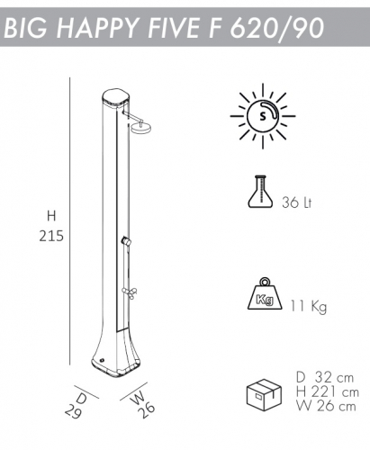 Уникальный дизайн летнего душа Big Happy Five 620/90 с нагревом воды от солнца сочетает в себе стиль и функциональность, простоту и изысканность. В нижней части корпуса душа находится дополнительный кран, который удобно использовать для мытья ног. Солнечный душ Big Happy Five 620/90 подходит для установки на открытом воздухе в гостиницах, кемпингах, туристических или пляжных курортах, или для частного использования.