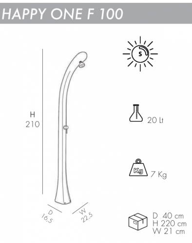 Уличный душ Happy One обладает инновационным и оригинальным дизайном, который сочетает в себе стиль и функциональность, простоту и изысканность.Солнечный душ Happy One подходит для установки на открытом воздухе в гостиницах, кемпингах, туристических или пляжных курортах, или для частного использования. Установка выполняется без проблем, простое подключение к любому садовому шлангу или постоянному водоснабжению.