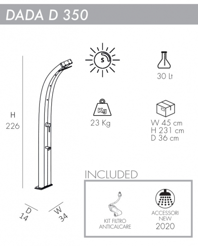 Благодаря своему стильному, функциональному и современному дизайну солнечный душ Dada D350 является жемчужиной в продукции компании. Он идеально подходит для установки как внутри, так и снаружи помещения, для сада, бассейна или пляжного домика. Чистый дизайн, элегантный и заботливый. В нижней части корпуса душа находится дополнительный кран, который удобно использовать для мытья ног.