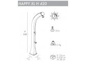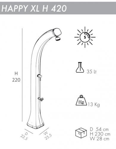 Дизайн летнего душа Happy XL H420 с нагревом воды от солнца сочетает в себе простоту и минималистичность. В нижней части корпуса душа находится дополнительный кран, который удобно использовать для мытья ног. Солнечный душ Happy XL H420 подходит для установки на открытом воздухе в гостиницах, кемпингах, туристических или пляжных курортах, или для частного использования.