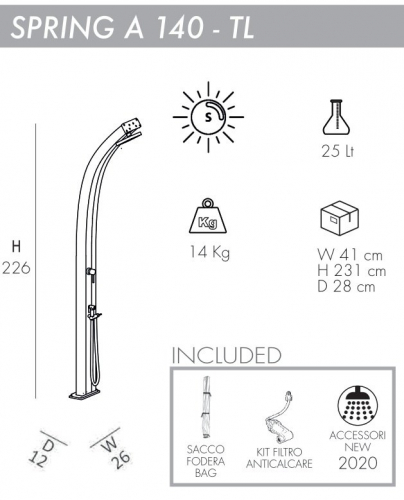 Вдохновленный дизайном коллекции Dada, но в уменьшенной версии, солнечный душ Spring A140-TL подходит для установки на открытом воздухе в гостиницах, кемпингах, туристических или пляжных курортах, или для частного использования. Инновационный и оригинальный дизайн летнего душа Spring A140-TL, выполненный со специальной отделкой и по технологиям последнего поколения, гарантирует смелую эстетику. Благодаря крупным вложениям, дизайнерскому решению и сложной системе окраски, Arkema создала уникальные уличные души в своем роде, с технологией покраски, используемой в автомобильном секторе. Его цвета - то, что отражает его название. Гармония и элегантность форм душа делают его подходящим для любой обстановки.