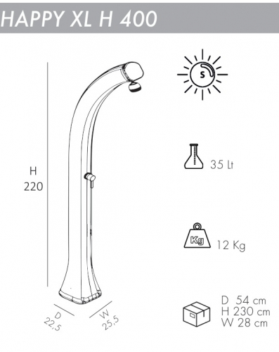 Дизайн летнего душа Happy XL H400 с нагревом воды от солнца сочетает в себе простоту и минималистичность. Солнечный душ Happy XL H400 подходит для установки на открытом воздухе в гостиницах, кемпингах, туристических или пляжных курортах, или для частного использования.