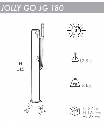 Солнечный душ Jolly Go JG180 подходит для установки на открытом воздухе в гостиницах, кемпингах, туристических или пляжных курортах, или для частного использования. Душ оснащен гибким шлангом и краном для мытья ног, благодаря которым удобство в использовании возрастает в несколько раз.