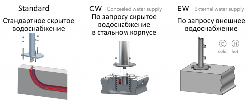 - Стандартное скрытое водоснабжение (Standard), которое подходит для использования душевой колонны на улице. Подключение к водоснабжению: ½ "F.