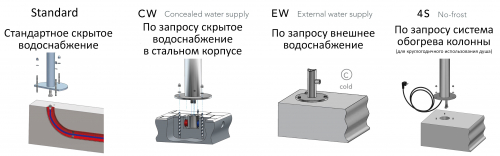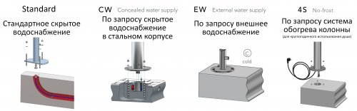 - Стандартное скрытое водоснабжение (Standard), которое подходит для использования душевой колонны на улице. Подключение к водоснабжению: ½ "F.