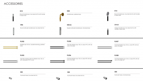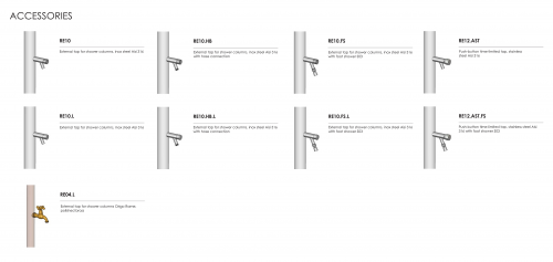 - Модель B76.2E - имеет кран с отделкой из нержавеющей стали AISI 316; скрытую душевую насадку ø76 мм с защитой от накипи; гибкий шланг длиной 150 см и лейку (ручной душ); водоснабжение: холодная и горячая вода.