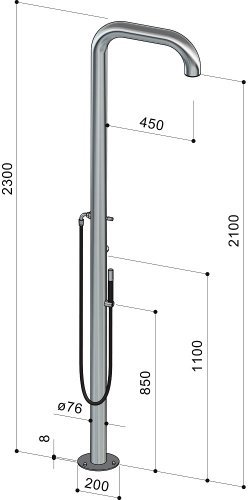 - Модель B76.2E - имеет кран с отделкой из нержавеющей стали AISI 316; скрытую душевую насадку ø76 мм с защитой от накипи; гибкий шланг длиной 150 см и лейку (ручной душ); водоснабжение: холодная и горячая вода.