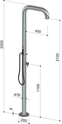- Модель B76.2E - имеет кран с отделкой из нержавеющей стали AISI 316; скрытую душевую насадку ø76 мм с защитой от накипи; гибкий шланг длиной 150 см и лейку (ручной душ); водоснабжение: холодная и горячая вода.