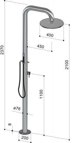 - Модель BW76.E - имеет кран с отделкой из нержавеющей стали AISI 316; насадку-лейку ø400 мм из нержавеющей стали AISI 316 с шаровым шарниром и защитой от накипи; гибкий шланг длиной 150 см и лейку (ручной душ); водоснабжение: холодная или предварительно смешанная вода.