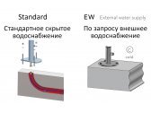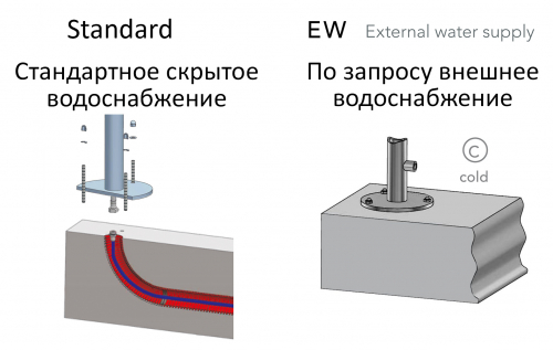 - По запросу можно реализовать внешнее водоснабжение (EW). Для этого у подножия душа на высоте 100 или 200 мм устанавливаются одна или две муфты (холодная/горячая) для подачи воды. Эти муфты оснащены внутренней резьбой ½ "F, и к ним можно подключить водопроводные трубы.