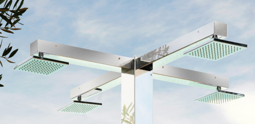 - Модель Q120 - имеет краны с отделкой из хромированной латуни; насадки-лейки размером 200x200 мм из нержавеющей стали AISI 316 с шаровым шарниром и защитой от накипи; водоснабжение: холодная или предварительно смешанная вода.