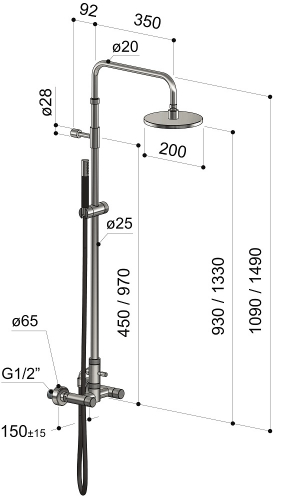 - Модель W63.E - имеет однорычажный смеситель; насадку-лейку S10 ø300 мм из нержавеющей стали AISI 316 с шаровым шарниром и защитой от накипи; гибкий шланг длиной 150 см и лейку (ручной душ) D10; водоснабжение: холодная и горячая вода.