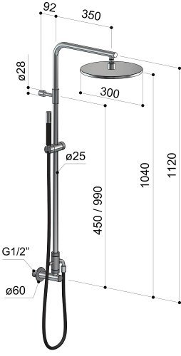 - Модель W62 - имеет ½ " головку с резиновым уплотнением VT01; насадку-лейку S10 ø300 мм из нержавеющей стали AISI 316 с шаровым шарниром и защитой от накипи; водоснабжение: холодная или предварительно смешанная вода.