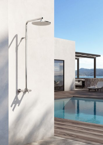 Дизайн уличного настенного душа Waterline сочетает в себе простоту и практичность. Душ подходит для установки на открытом воздухе в гостиницах, кемпингах, туристических или пляжных курортах, или для частного использования.