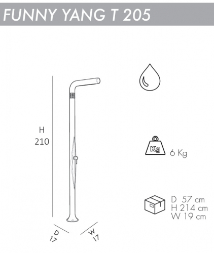 Уличный душ Funny Yang T205 с инновационным и оригинальным дизайном идеально подходит для установки как внутри, так и снаружи помещения, для сада, бассейна или пляжного домика. Чистый дизайн, элегантный и заботливый. Это просто, весело, современно. Его цвета - то, что отражает его название. Проект данных душей выполнен Giancarlo Rusconi, чье имя является синонимом качества и внимания к дизайну и имеет свою подпись в металлическом кольце в верхней части душа.