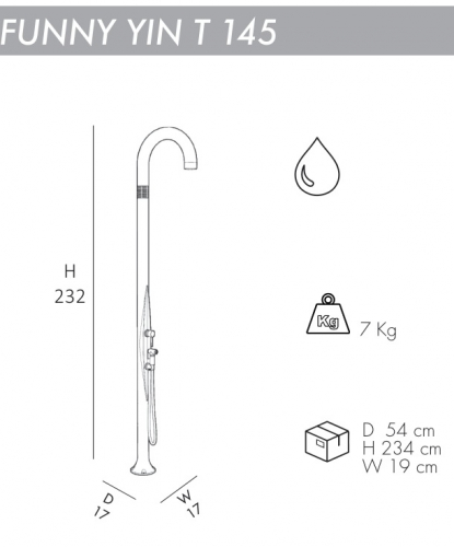 Уличный душ Funny Yin T145 с инновационным и оригинальным дизайном идеально подходит для установки как внутри, так и снаружи помещения, для сада, бассейна или пляжного домика. Чистый дизайн, элегантный и заботливый. Это просто, весело, современно. Его цвета - то, что отражает его название. Проект данных душей выполнен Giancarlo Rusconi, чье имя является синонимом качества и внимания к дизайну и имеет свою подпись в металлическом кольце в верхней части душа. Душ оснащен гибким шлангом, благодаря которому удобство в использовании возрастает в несколько раз.
