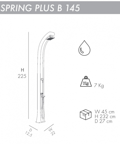 Дизайн летнего душа Spring Plus B145 сочетает в себе стиль и функциональность, простоту и изысканность. Он идеально подходит для установки как внутри, так и снаружи помещения, в гостиницах, кемпингах, туристических или пляжных курортах, или для частного использования. Чистый дизайн, элегантный и заботливый. Душ оснащен гибким шлангом, благодаря которому удобство в использовании возрастает в несколько раз.