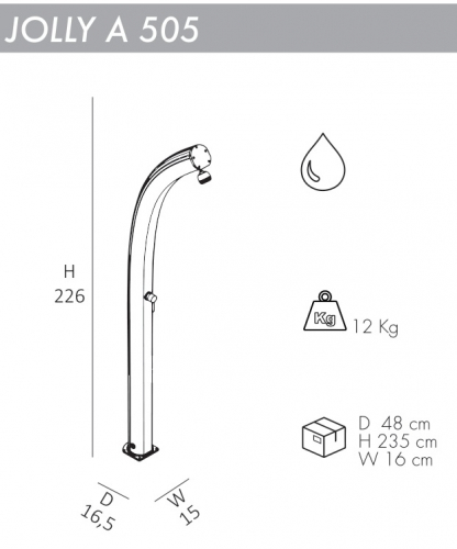 Благодаря своему инновационному и оригинальному дизайну душ Jolly A505 идеально подходит для установки как внутри, так и снаружи помещения, для сада, бассейна или пляжного домика. Чистый дизайн, элегантный и заботливый. Душ особенно подходит для использования на открытом воздухе. Установка выполняется без проблем, простое подключение к постоянному водоснабжению холодной и горячей воды.