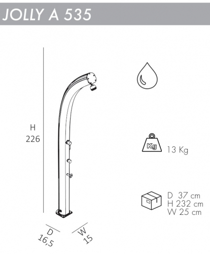 Благодаря своему инновационному и оригинальному дизайну душ Jolly A535 идеально подходит для установки как внутри, так и снаружи помещения, для сада, бассейна или пляжного домика. Чистый дизайн, элегантный и заботливый. Душ Jolly A535, имеющий кнопку-таймер, разработан специально для общественных мест, где необходимо сократить расход водных ресурсов. В нижней части корпуса душа находится дополнительный кран, который удобно использовать для мытья ног. Установка выполняется без проблем, простое подключение к постоянному водоснабжению холодной и горячей воды.