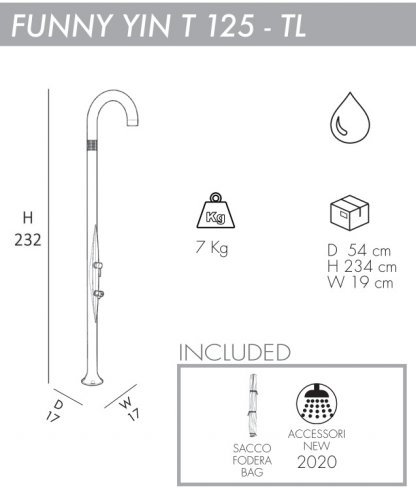 Уличный душ Funny Yin T125-TL с инновационным и оригинальным дизайном, выполненный со специальной отделкой и по технологиям последнего поколения, гарантирует смелую эстетику. Благодаря крупным вложениям, дизайнерскому решению и сложной системе окраски, Arkema создала уникальные уличные души в своем роде, с технологией покраски, используемой в автомобильном секторе. Его цвета - то, что отражает его название. Гармония и элегантность форм душа делают его подходящим для любой обстановки, для сада, бассейна или интерьера.