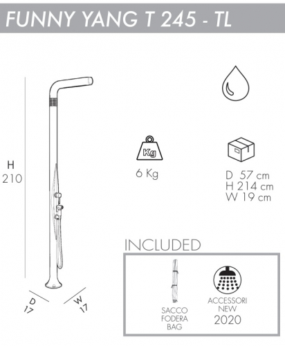 Уличный душ Funny Yang T245-TL с инновационным и оригинальным дизайном, выполненный со специальной отделкой и по технологиям последнего поколения, гарантирует смелую эстетику. Благодаря крупным вложениям, дизайнерскому решению и сложной системе окраски, Arkema создала уникальные уличные души в своем роде, с технологией покраски, используемой в автомобильном секторе. Его цвета - то, что отражает его название. Гармония и элегантность форм душа делают его подходящим для любой обстановки, для сада, бассейна или интерьера.